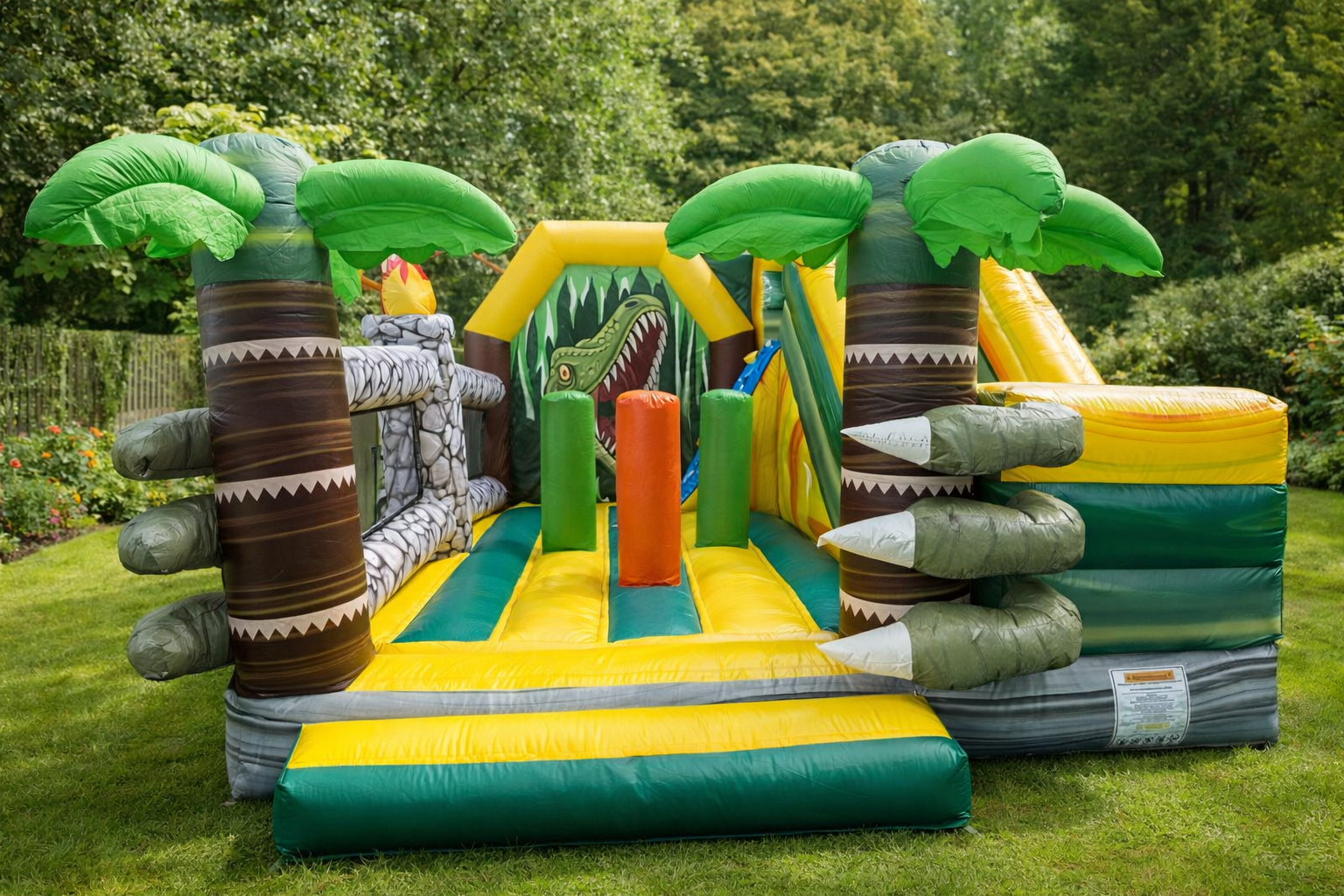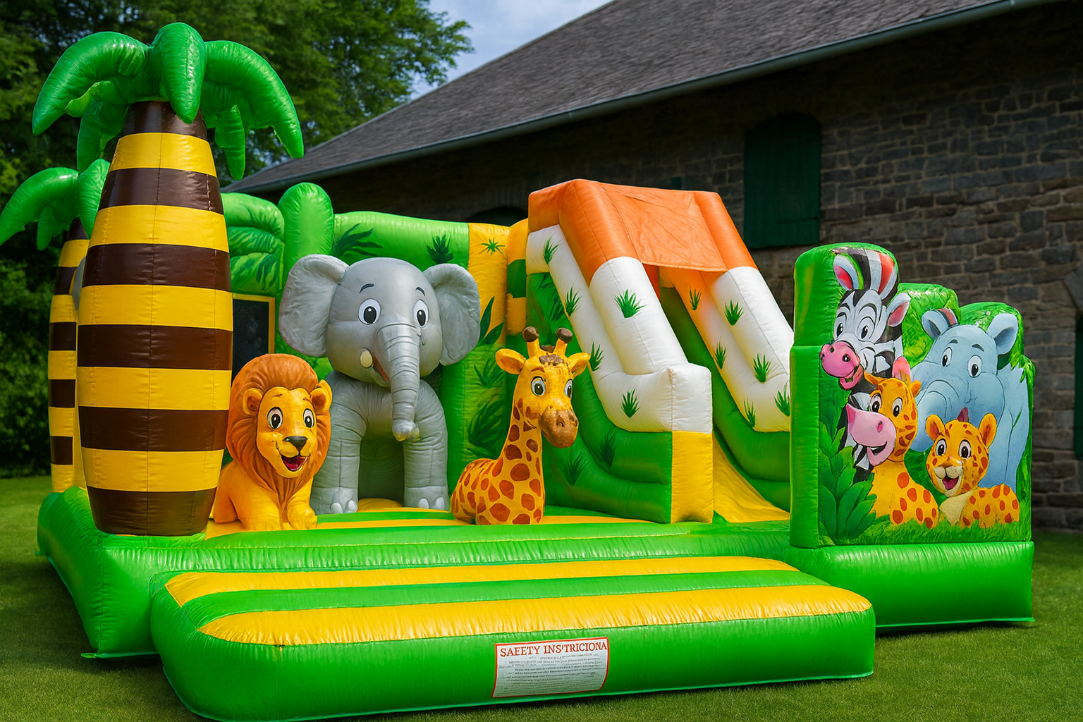 Wilde Tiere und tropische Pflanzen machen diese Hüpfburg zum Highlight jeder Party.